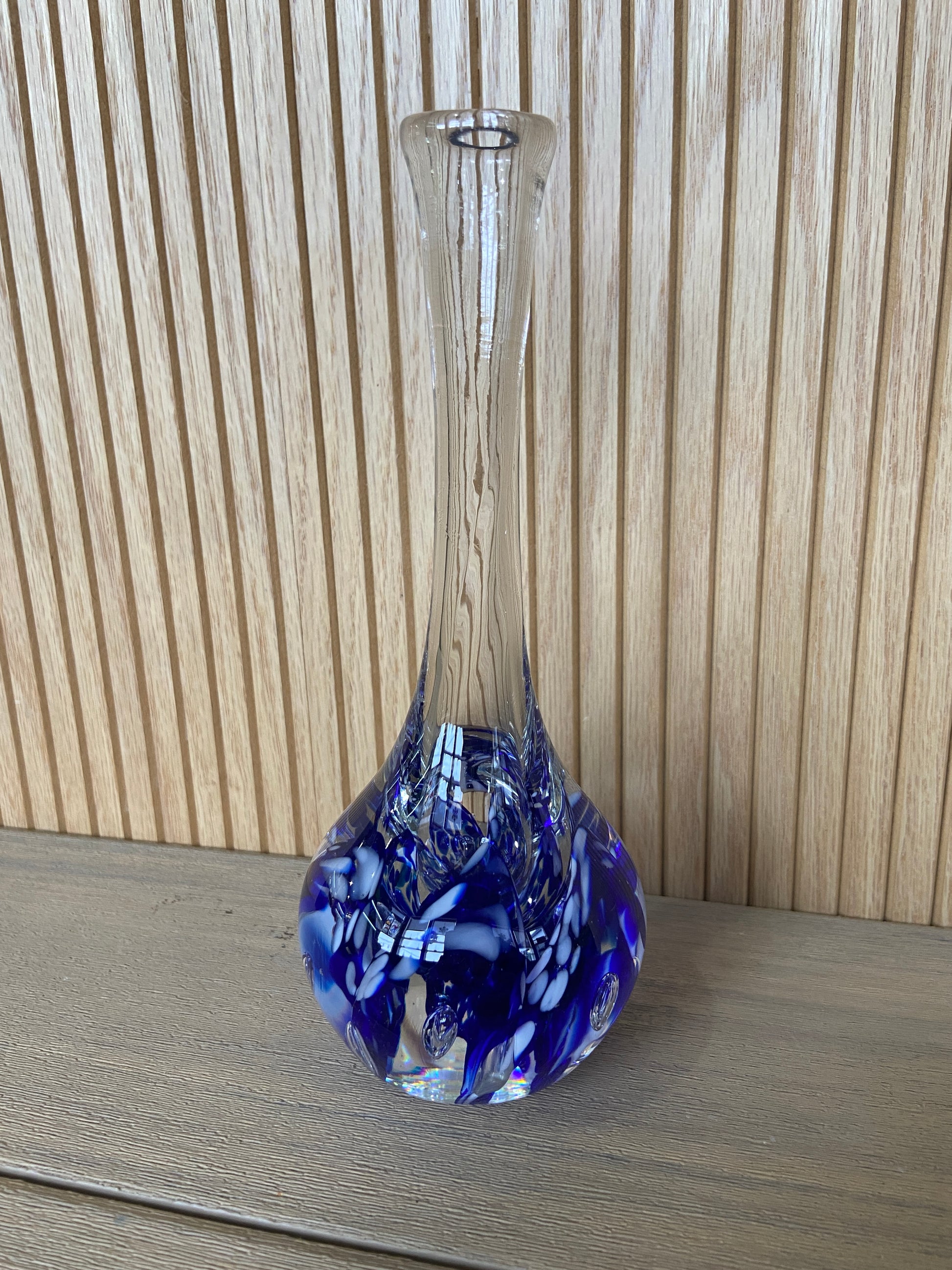 This is the first blown piece that Grandfather Victor produced. It was created a hair taller than most bud vases to accommodate a long-stemmed flower. The evolution of the bud vase can be traced through the entire family. Starting in 1940’s through to the 1980’s it is the best piece to see the different generations’ artistic interpretations. Dimensions: L3"xW3"xH8"